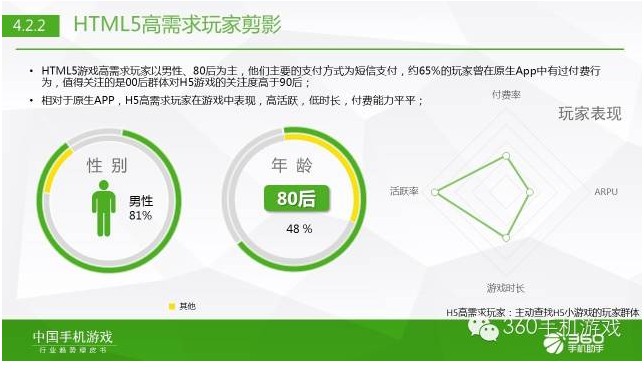 除此之外,冯燃还强调,H5游戏也是今年手游发展的新方向。他指出,相对于原生APP,H5游戏高需求玩家在游戏中呈现高活跃、低时长、付费能力平平的特点,但是他们中间约有65%的玩家曾在原生APP中有过付费行为,有着良好的付费基础。相信随着国内H5技术的发展,H5游戏在画质、音效、操作等方面会有很大改善,付费率和ARPU也会得到提升。