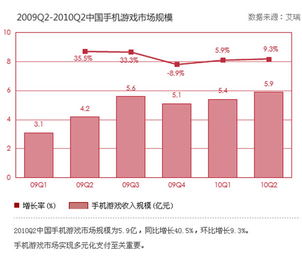 和端游不同的是,移动游戏迎来的高速增长。2010年Q2的移动游戏市场规模达到5亿,但增长率同比增长却达到40.5%。游戏厂商对移动游戏的期盼昭示着手游的即将腾飞。