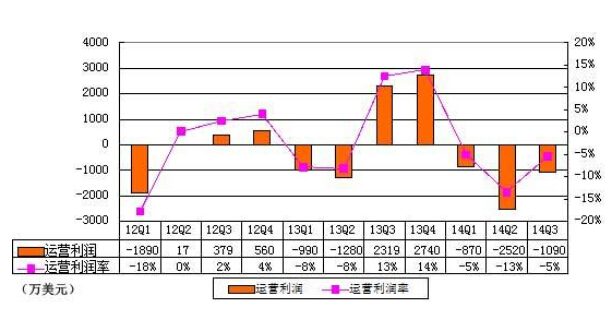新浪第三季度运营亏损为1090万美元,上年同期为运营盈利2320万美元。新浪第三季度运营利润率为-5%。这已是新浪连续3个季度运营亏损。